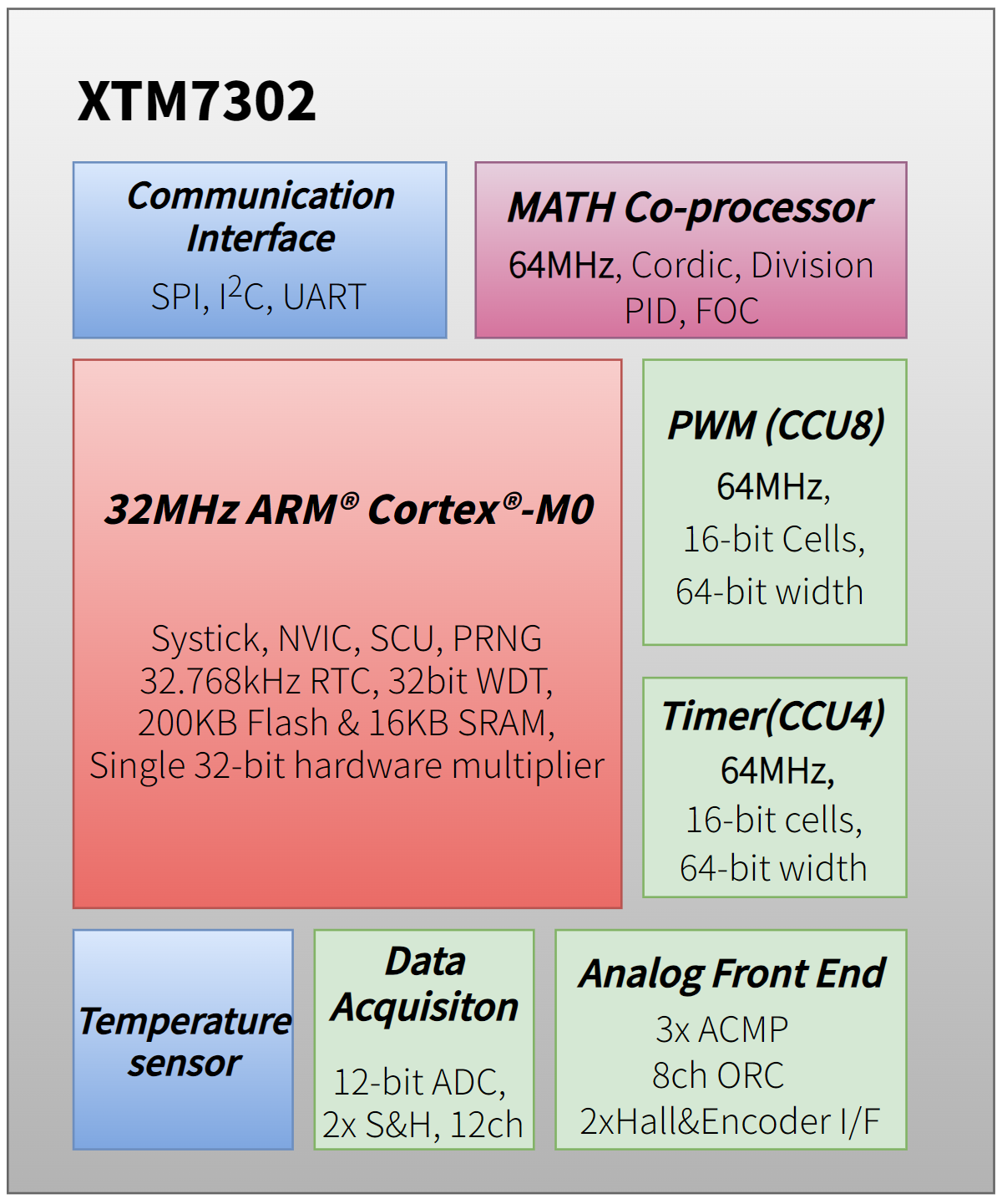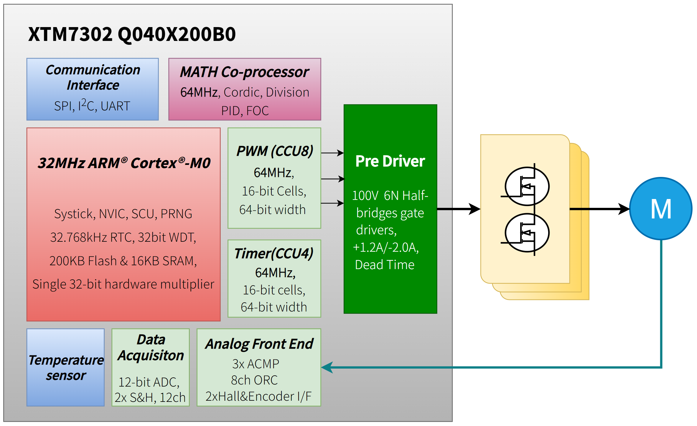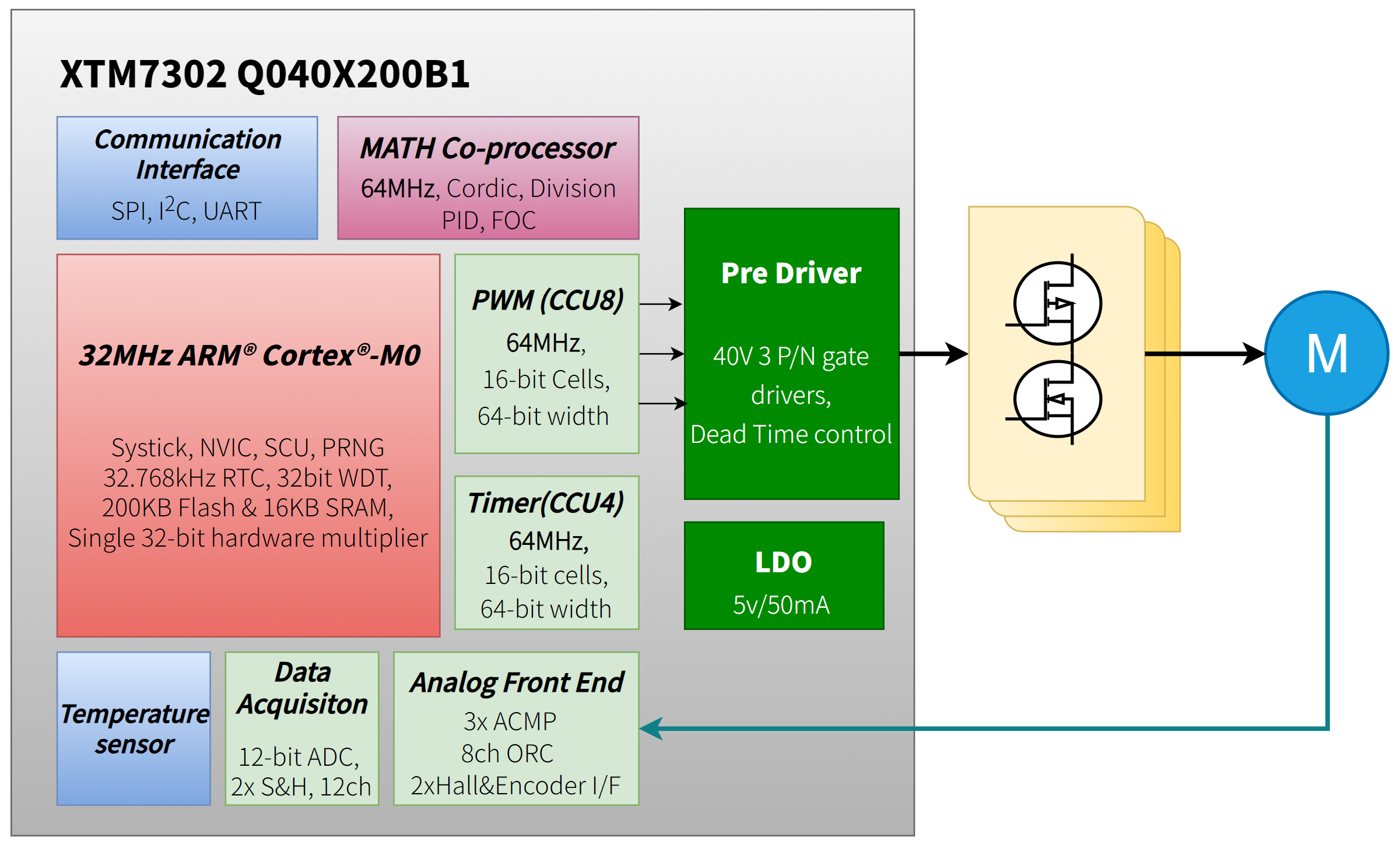 XTM7302全系列搭载32位Arm Cortex-M0内核,最高32MHz主频、64MHz外设时钟,内置200KB Flash, 配备专用数学协处理器,高效的数据处理能力可为FOC、BLDC等复杂工业算法提供充沛的支撑与保障。